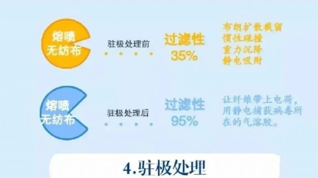 對于醫用口罩,帶駐極母粒和駐極高壓電處理的駐極熔噴布,這層是最核心的部分,只有駐極處理后熔噴布上很多電荷才對也同樣帶電荷的0.3微米的非油性小顆粒物有高效的吸附效果,通常要求要大于95%以上,這個其實只有專業的儀器才能測試出來,有些廠家也用兩層25-28克駐極處理后的熔噴布去達到50-60克駐極熔噴布的效果!