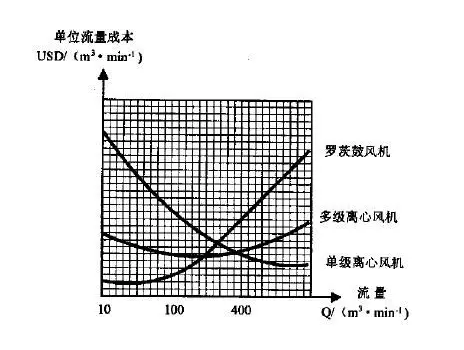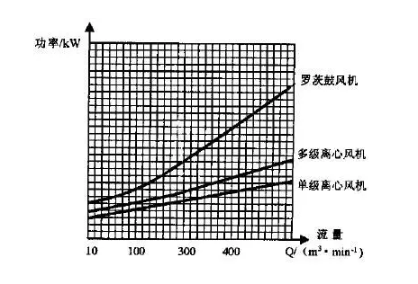 三種風(fēng)機(jī)的能耗對比見:三種風(fēng)機(jī)流量—功率曲線圖(見圖1) 。在流量較小時,三種風(fēng)機(jī)效率差異不是很顯著;對于大流量風(fēng)機(jī),由于羅茨式轉(zhuǎn)速無法提高,效率較低;另兩種離心風(fēng)機(jī)差距較小。